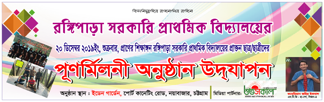 চট্টগ্রাম নগরীর হালিশহর থানাধীন ২৪ নং ওয়ার্ডস্থ রঙ্গীপাড়া সরকারি প্রাথমিক বিদ্যালয়ের ৭৫ বছর পুর্তি উপলক্ষে স্কুলের প্রাক্তন ছাত্র-ছাত্রীদের উদ্যোগে স্কুলের এই প্রথম পূণর্মিলনী-২০১৯ উদযাপন হতে যাচ্ছে। প্রাক্তন ছাত্র-ছাত্রীদের এই মিলনমেলা অনুষ্ঠিত হতে যাচ্ছে চলতি বছরের ২০ই ডিসেম্বর শুক্রবার।