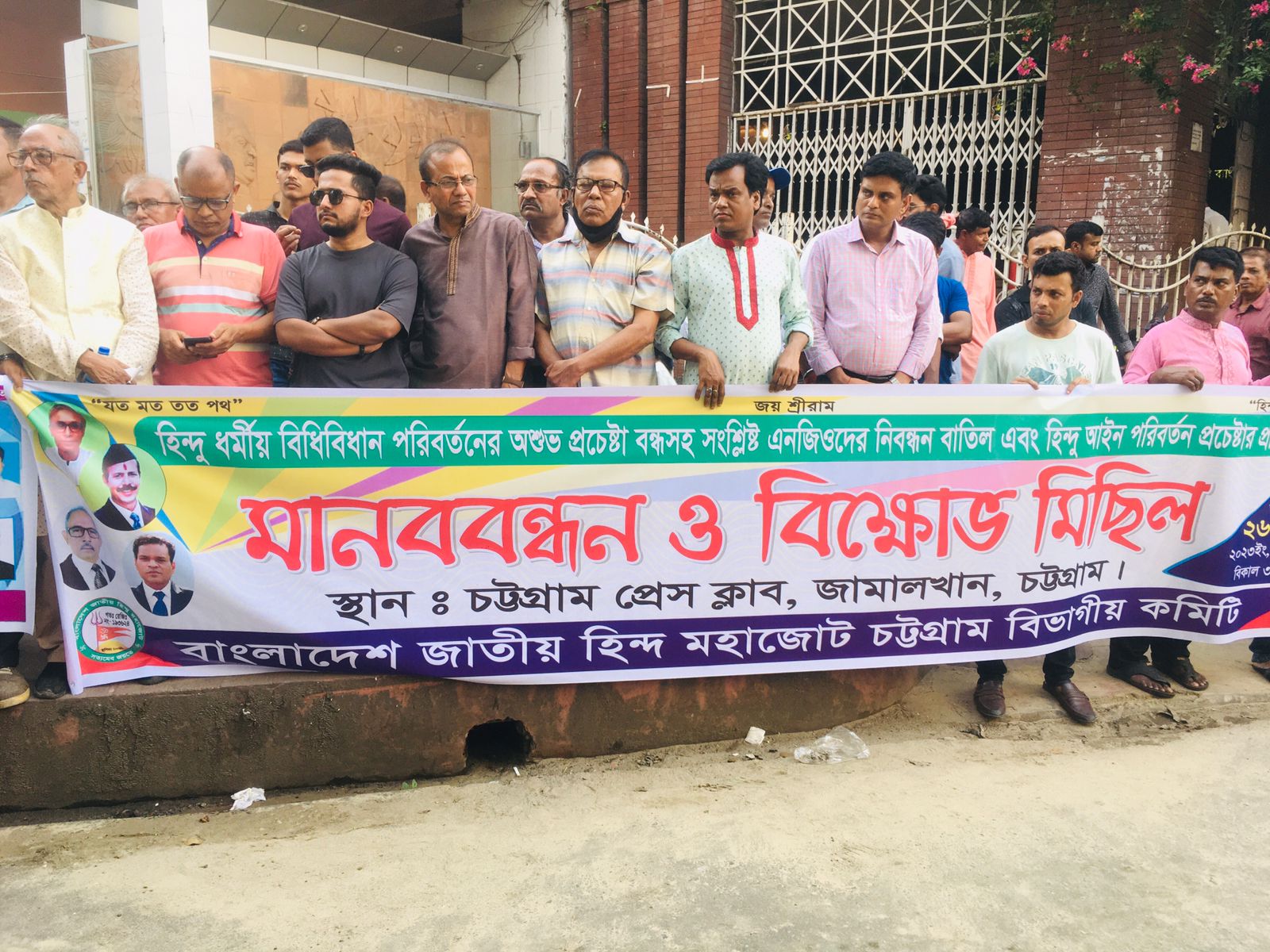 হিন্দু ধর্মীয় বিধিবিধান পরিবর্তনের অশুভ প্রচেষ্টা বন্ধসহ সংশ্লিষ্ট এনজিওদের নিবন্ধন বাতিল এবং হিন্দু আইন পরিবর্তন প্রচেষ্টার প্রতিবাদে মানববন্ধন ও প্রতিবাদ সমাবেশ অনুষ্ঠিত হয়।